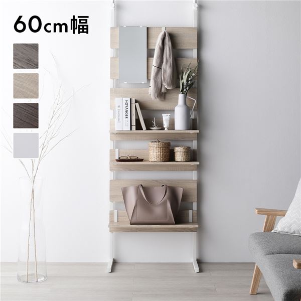 ■突っ張り ウォールラック 〔 60cm幅 ナチュラル×ホワイト 〕 ミラー付 鏡付 壁面収納 棚 賃貸OK 工事不要 ウォールラック パーテーショ
