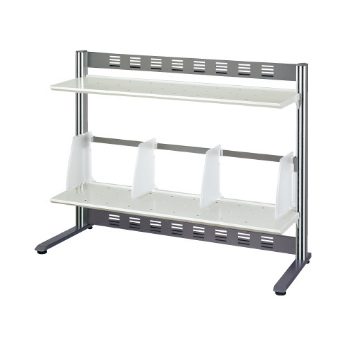 ●色/ライトグレー ●仕様/可動式仕切板4枚付き・棚2段 ●外寸法(W・D・H)/836・330・640mm ●棚板寸法/W800×D215×H18mm ●製品質量/11.4kg ●耐荷重/棚板1枚:196N(約20kgf)、棚板を追加した場合などの総耐荷重:490N(約50kgf) ●材質/仕切板:ABS、アジャスター(樹脂部):PA6、ストッパー:PC、棚板・背板:スチール、脚ベース部:アルミダイカスト、支柱:アルミ押出し型材(アルマイト仕上げ) ●組立式 ●棚板高さ調節間隔/25mm