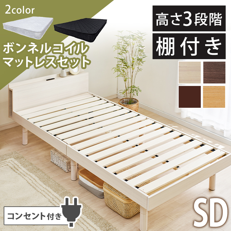 ベッドフレームとマットレスのセットです。【棚付きベッド セミダブル TKSB-SD】高さ3段階、サイド収納も備えた棚、2口コンセント付きのがっちりスノコベッドです。◆天然木無垢材の木目が楽しめるナチュラルフレーム◆高さ約3段階調節可能なシンプルデザイン◆通気性抜群で湿気を溜め込まないすのこ◆布団が使える18mmの極厚すのこ・高耐久構造で耐荷重200kg◆枕元に便利、ブックシェルフ棚・2口コンセント付き★お客様組立★【圧縮ロールボンネルコイルマットレス】硬めの寝心地がお好みの方におすすめ!高品質ボンネルコイル使用で、体の負担を和らげます。高密度コイル、強度・耐久性に優れたスプリングを採用。コンパクトな圧縮梱包でお届けします。【棚付きベッド セミダブル TKSB-SD】