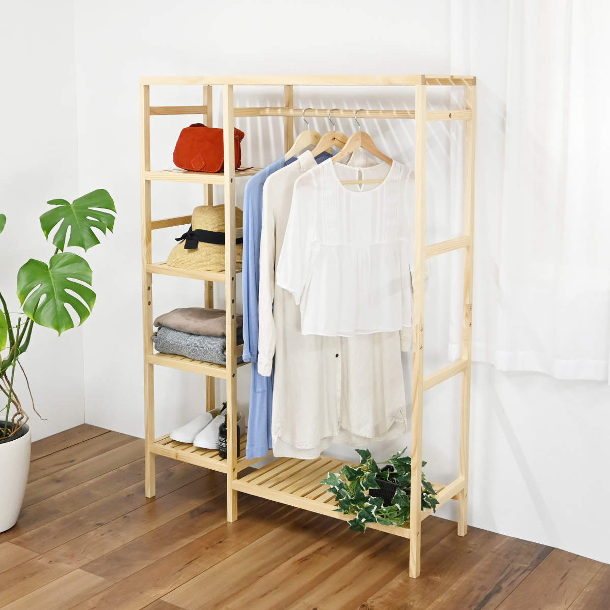 ■ハンガーラック 4段棚付 天然木フレーム 約幅97cm ( ハンガー ラック 収納 家具 棚 天然木 コート掛け 四段 衣類 ハンガーポール 洋服収