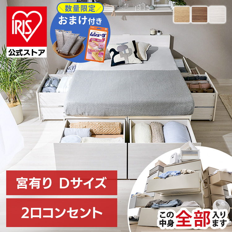 ■ベッド ダブル 収納 大容量 超収納 引出し 8個 棚 2口コンセント 滑り止め付 布団 洋服 家電 小物収納 ベッドフレーム ヘッドボード 宮付