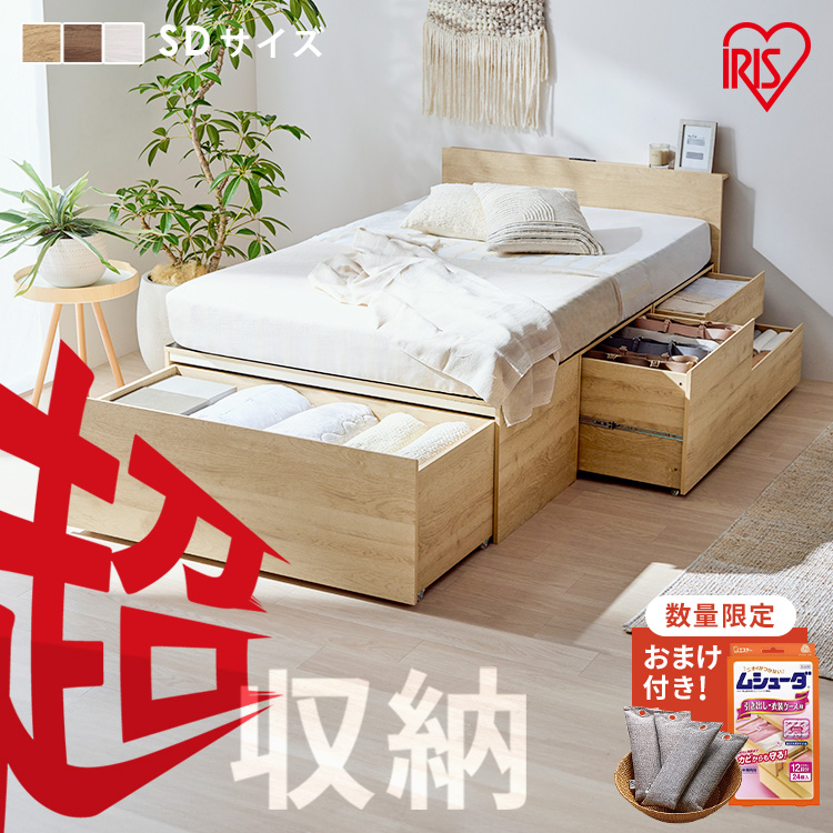 ■ベッド セミダブル 収納 大容量 超収納 引出し 4個 棚 2口コンセント 滑り止め付 布団 洋服 家電 小物収納 ベッドフレーム ヘッドボード