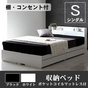 ■ベッド シングル 収納ベッド / ポケットコイルマットレス 付き / 棚 コンセント 付き シンプル ホワイト ブラック 白い 黒 ベット 送料無