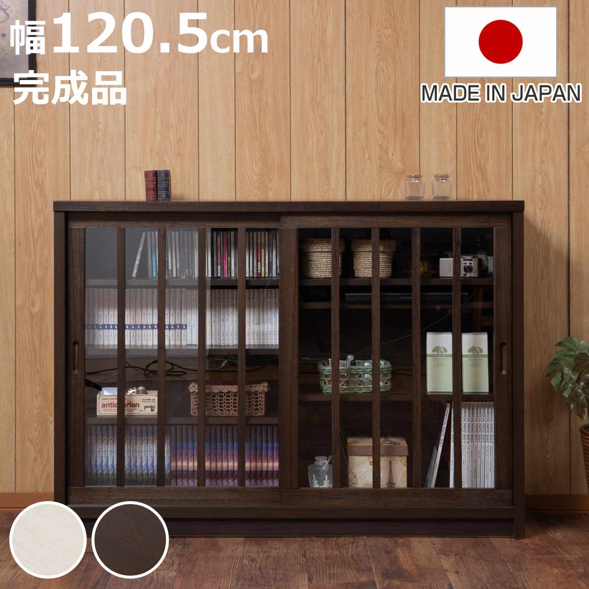 ■キャビネット 幅120.5cm ガラス引き戸 縦格子 和モダン調 日本製 完成品 ( 棚 ラック 収納チェスト 収納 格子 引き戸 天然木 桐 木製 家