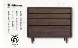 家具の町大川市の自社工場で細部まで丁寧に仕上げたチェストです。可愛らしい丸みのある外観は、角を削り落としてツキ板を手張りする特殊な製法で手作りしています。底面に付いた4本の円錐脚もウォールナット材でロクロ加工したもので、高級感があります。上から段々と深くなる設計で、小物から大容量まで幅広い収納で便利にお使いいただけます。リビングはもちろん寝室・ダイニングなどあらゆる場所でおしゃれな空間作りに活躍します。【ウォールナット材について】クルミ科の広葉樹で北米が産地です。暗褐色の深い色合いと、美しい木肌が魅力です。天然の高級木材ならではの美しい経年変化も楽しんでいただけます。【オイルフィニッシュについて】滑らかに研磨した木肌に天然由来のオイルを使用したオイルフィニッシュです。木材に