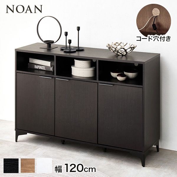 リアルな木目調シートに、マットブラックのアイアンを組み合わせたデザインで、おしゃれで上質な空間を演出します。北欧インテリアや、和の要素を取り入れたジャパンディスタイルにも自然と溶け込みます。1段目のオープン収納にはコード穴が付いており、PCやスマートフォン、タブレットなどの収納・充電に便利です。扉付き収納は、本や書類など普段は隠しておきたい収納にぴったり。カラーはナチュラル・ダークブラウン・ホワイトウォッシュの3色からお選びいただけます。【商品サイズ(約)】幅120×奥行40×高さ82cm【梱包サイズ(約)】129×43.5×12cm(23.7kg)/85×44.5×14cm(22.3kg)【材質】プリント紙化粧パーティクルボード【生産国】マレーシア【備考】組立品(プラスドライバー・ハンマーが必要)