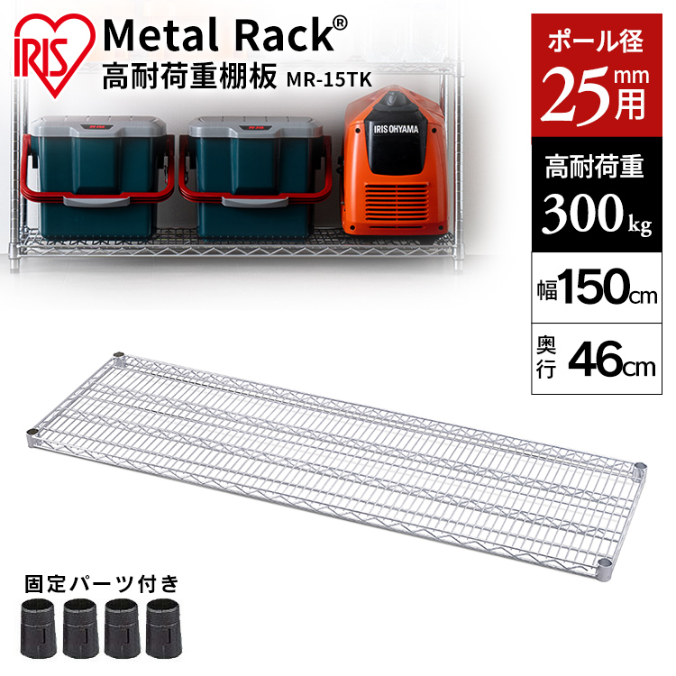 メタルラック用高耐荷重棚板。メタルラック史上最高耐荷重。棚板1枚あたりの耐荷重300kg!抜群の強度で、たわまない!金庫やタイヤなどの重い荷物も収納できます。●商品サイズ(cm)幅約150×奥行約46×高さ約4●ポール径直径25mm仕様●耐荷重1枚あたり:約300kg●主要材質棚板:スチール(クロムメッキ)固定部品:ABS樹脂※耐荷重は測定値であり、保証値ではありません。≪当社指定の運送会社で配送致します≫配達時間指定は出来ません。代金引換でのお支払は出来ません。他商品との同時注文は出来ません。