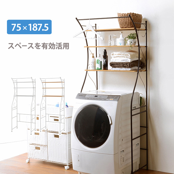 【商品説明】アイアンの曲線がエレガントで、デッドスペースを有効活用できる洗濯機ラック。上のバーは室内干しにも使えます。【商品サイズ(外寸)】(約)幅75×奥行42×高さ187.5cm【材質】主材:スチール, プリント化粧繊維板【生産国】中国【備考】アジャスター付き棚板サイズ:(約)幅71×30cm組立式