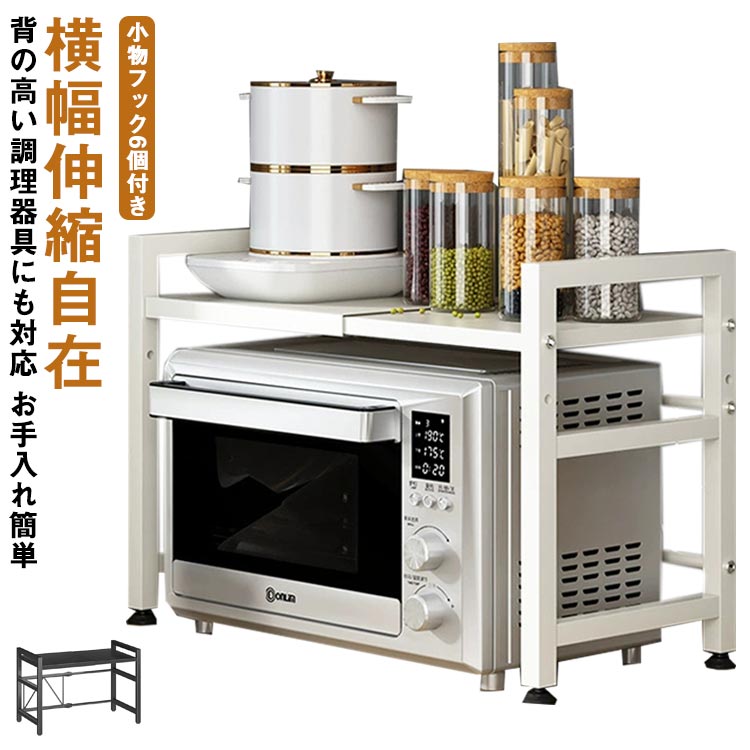 ■レンジ上ラック 1段 高さ調節 伸縮 キッチンラック フック6個付き レンジラック カウンター上収納 スチール 家電収納 棚 電子レンジ台 冷