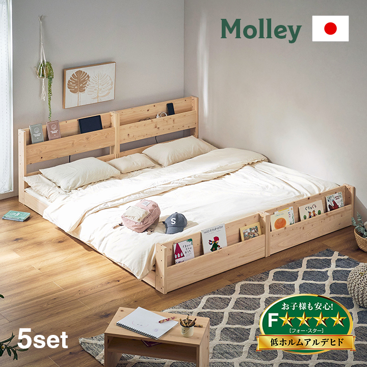 ■【5年保証/大川産/九州産ひのき使用】二段ベッド 2段ベッド Molley(モーリー) 5点セット トコマットシングルx2+ファミリー掛・敷 ヒノキ