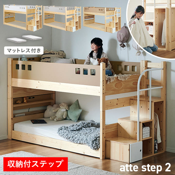 ■二段ベッド 2段ベッド 階段付き マットレス 2枚セット atte step2(アッテステップ2)+Unity(ユニティ) 3色対応 宮棚付き おしゃれ 子供