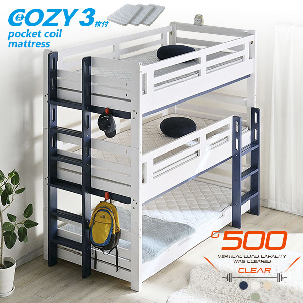 ■【特許申請構造】三段ベッド 3段ベッド 耐荷重500kg Eeny3 flat(イーニー3 フラット) + マットレス COZY S 3点セット 4色対応 三段ベット