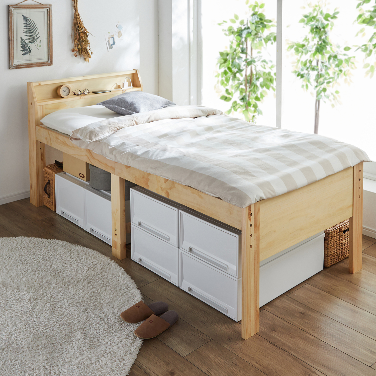 天然木パイン材を使用した頑丈ベッドすのこ裏の桟木の厚みを従来品の約1.5倍にしているため、ベッドの軋みが気になる方におすすめですベッド下には大容量の収納スペースがあり、衣類ケースはもちろん、普段使わないキャリーケースなどもすっぽり収まります宮部分はスマートフォンや時計を置くことができ、2口コンセント付きです色は3色展開。カントリー調のデザインで優しい風合いです