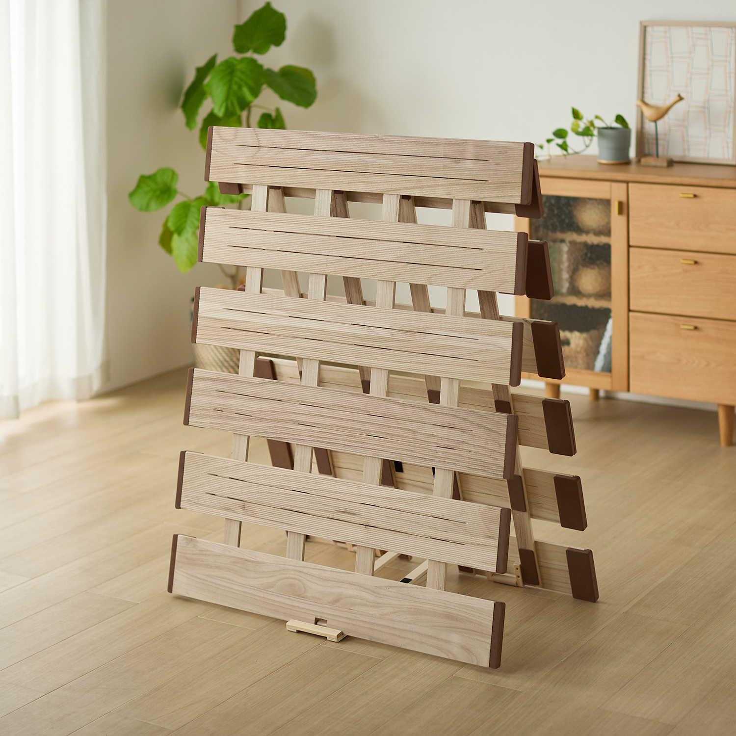 毎日の睡眠を快適にしたい・・・毎日のことだから良いものを使いたい・・・そんな思いから生まれた薄型軽量設計のすのこベッドです特許技術のスリット加工で敷布団の下に敷くだけで通気性を確保できます幅広のすのこに細かく入れた凹凸加工でお布団が滑りにくい仕様に足の指をぶつけても痛くないよう、すのこ板側面はやわらかいクッション材付きで小さいお子さまにも安心本体は2つ折れ仕様なので、簡単な動作でサッと折りたためば布団干しに早変わり薄型軽量設計なので移動も楽々、片づけも簡単です
