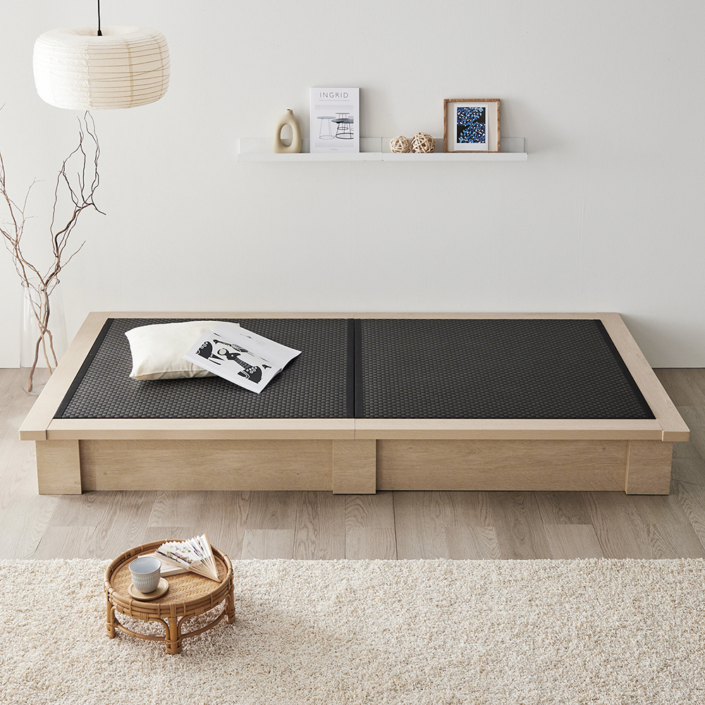 落ち着いた和のあしらいを残しつつ、すっきりしたデザイン畳ベッド床板はには高機能畳「MIGUSA」を使用 色褪せしにくく、水や汚れににも強い機能性畳 経年劣化が起こりにくく、表面の割れ、毛羽立ちがでにくい高い耐久性 ダニ・カビが発生しにくいのでお子さまにも安心 豊富なカラー展開も魅力立ち上がりやすく日々の動作がしやすい床板の高さボックス型のベッドフレームでほこりやごみなどが侵入しにくい形状通常のマットレス床板より分厚く頑丈な畳用床板を使用しているので今まで使っていた敷布団がそのままお使いいただけます畳はズレにくいのに取り外しやすい設計にリビングでちょっとした小上がり的なくつろぎスペースとして使用するのもおすすめです#小上がり#和モダン#ベッドフレーム#ステージベッド