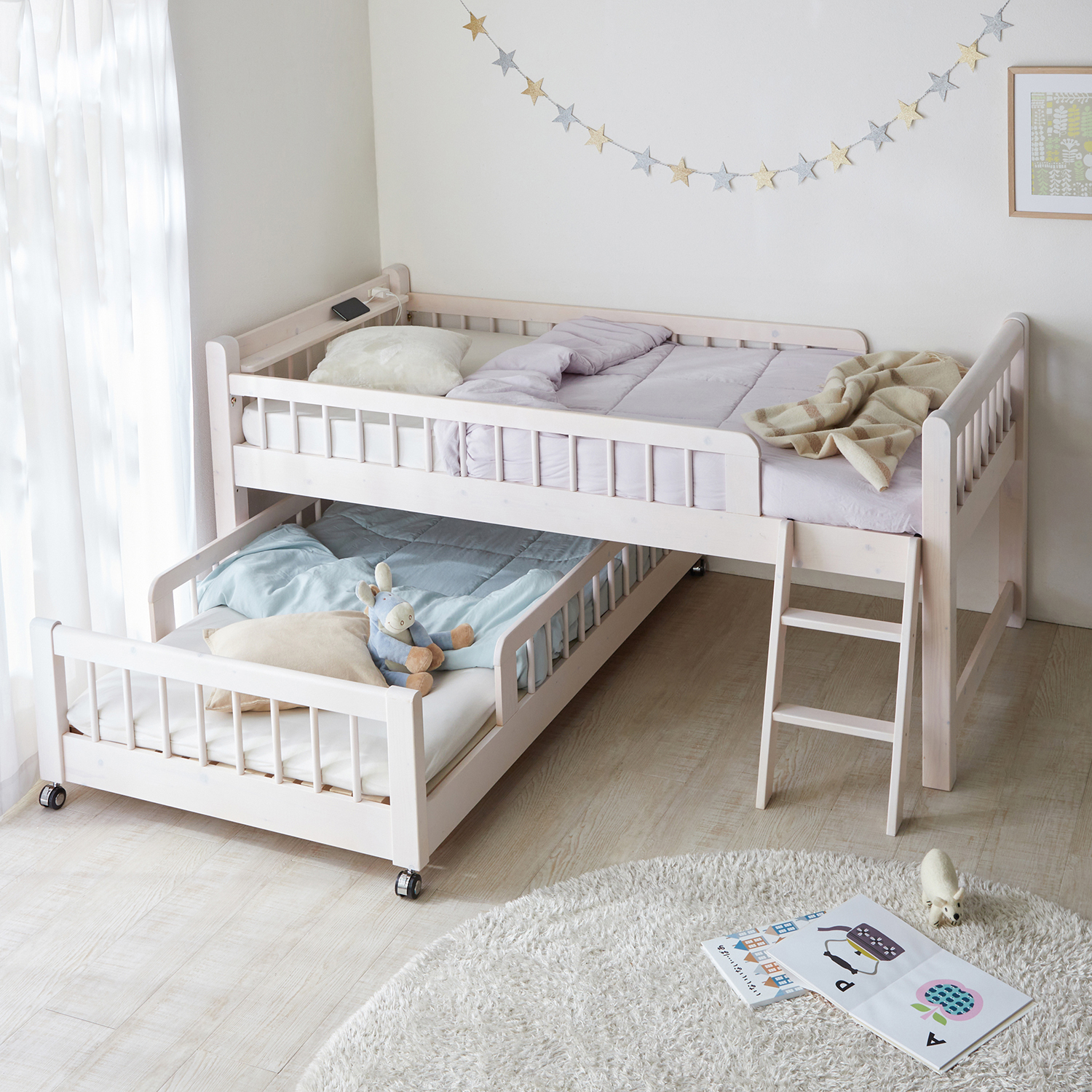 寝る時に下段ベッドを引き出すタイプの2段ベッド下段ベッドはキャスター付き低めの2段ベッドなので高いところが苦手な方でも安心上段のみ宮棚と2口コンセント付き宮棚は携帯電話や目覚まし時計を置くのに最適床板は通気性のいいすのこ仕様子供部屋などの子供用ベッドとしておすすめ
