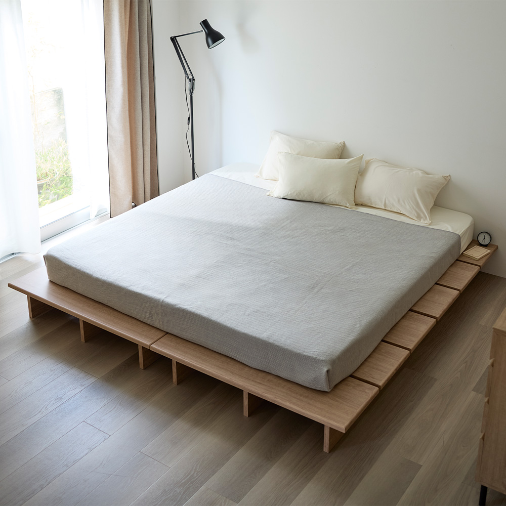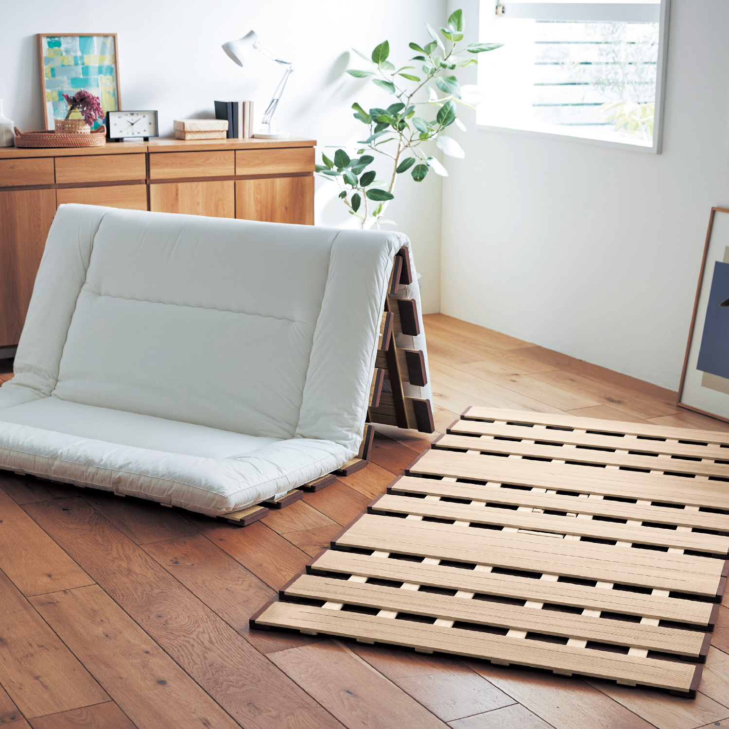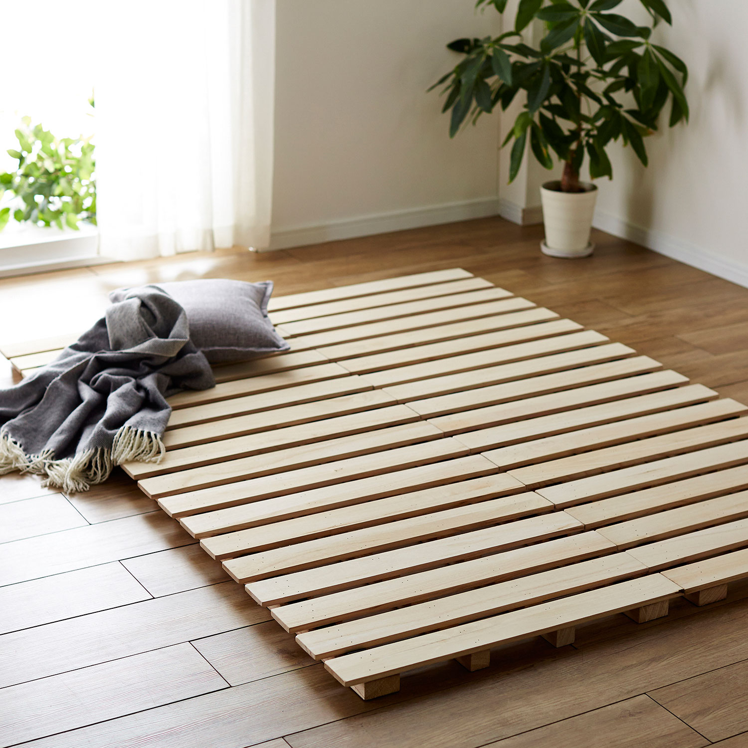 ーデザイン・スタイリングー・どんな空間でも使いやすいシンプルなデザイン・組み合わせればファミリーサイズにも対応ー素材ー・桐材で軽く、取り扱いやすいので収納もラクラク・表面のスリット加工で布団やマットレスが滑りにく、通気性も確保・底面と端に床を傷つけにくいクッション付き・脚が当たっても痛くない角丸仕様ー機能ー・山型にセットすれば、そのまま布団が干せます・折りたたむと押入れにも収納OK・3つ折り式のマットレスにも対応