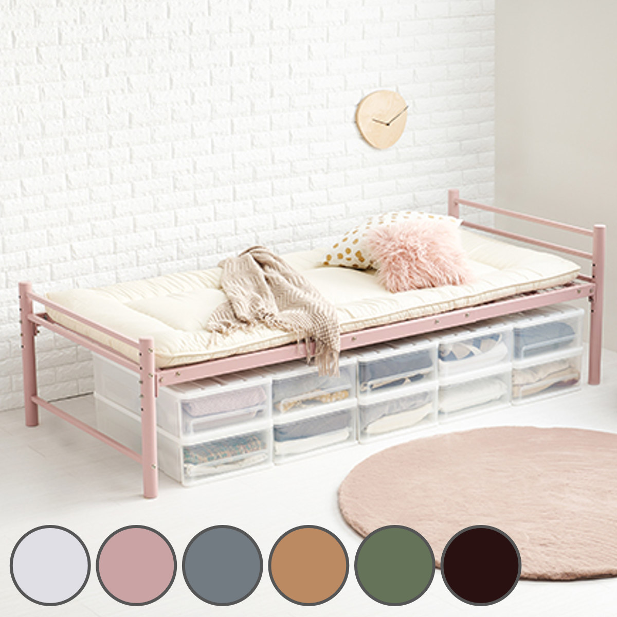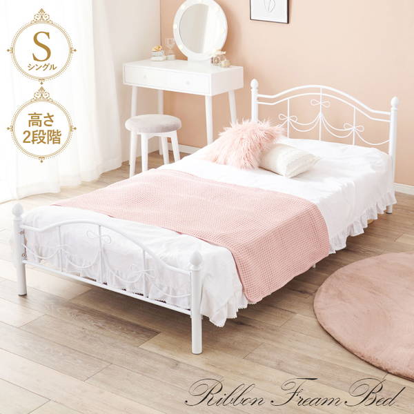 ■商品説明 ●シンプルですっきりしたフォルムにリボンの装飾をあしらった可愛いベッドフレーム。 ●女の子に嬉しい可愛らしい、白一色のお洒落なインテリアです。 ●ヘッド・フッドボードやポールの先端など、色々な場所にあしらわれた装飾はどの角度から見ても可愛く、気分を盛り上げます。 ●マットレスは薄型・スプリング入りどちらも対応。床面の高さを変更できるので厚みがある寝具でも装飾が隠れません。 ●ベッド下のスペースは収納スペースとしてお使いいただけます。 ●床面は通気性の良いメッシュ床になっているので通気性が良いので湿気がこもりにくく、気持ちよく眠れます。 ■商品詳細 サイズ(約):幅100×奥行206×高さ74×床面高31/20cm 耐荷重:約90kg 素材:主材:スチール 組立:お客様組み立て式 床面サイズ:98×198cm