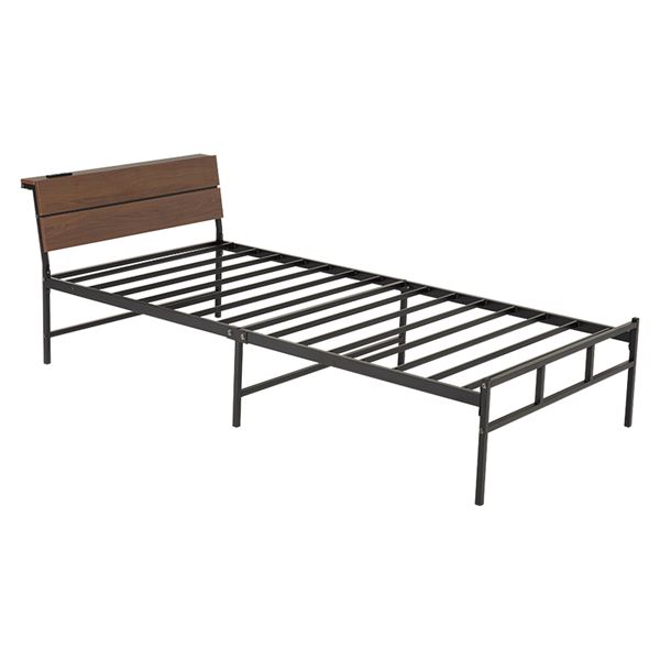 スチールフレームでスッキリとした印象のシングルベッド。ヘッドボードは木目調の傾斜があるパネル仕様です。便利な2口コンセント付き