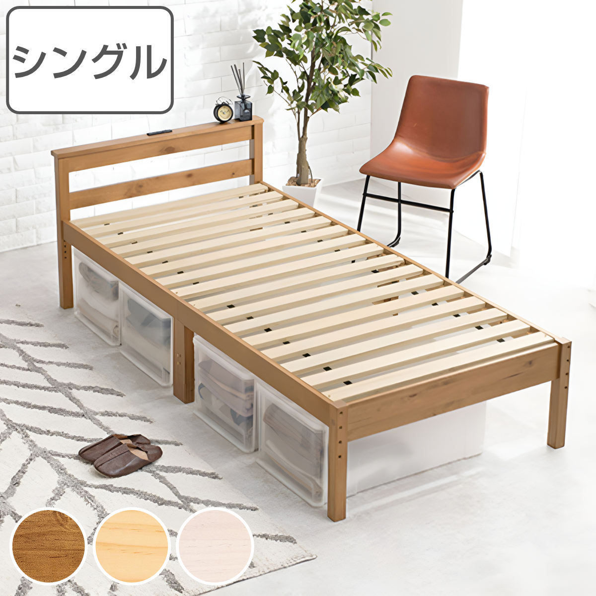 ■シングルベッド すのこ 2口コンセント 宮棚付 高さ調節 床下収納 天然木 ( シングル すのこベッド スノコ ベット フレーム 98×208cm ロ