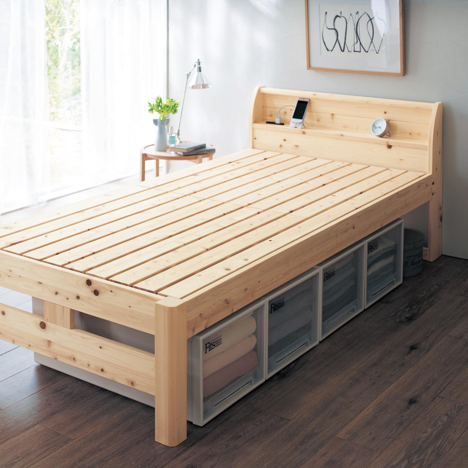 上質な国産ひのきを広島の工場で丁寧に加工【耐荷重500kg(布団使用時)を誇る頑丈なベッド】フレームの中央に支柱を追加することで安定性を高め、きしみにくい構造になっています床板には目の詰まったすのこを採用通気性を確保しながらもとても丈夫なつくり高さをお好みに合わせて2段階に調節可能高く設定すれば、ベッド下に収納ケースの設置もOK宮部にはコンセント2口を設けているので、スマートフォンなどを充電できて便利ですナチュラル感あふれる無垢材の風合い丸みを帯びた細部のあしらいがやさしい空間を演出