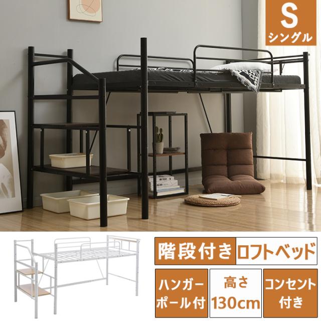 ■シングルベッド 単品 宮付き ロフトベッド (フレームのみ) シルバー コンセント付き 梯子付き スチールパイプ シングルベッド 単品 宮付