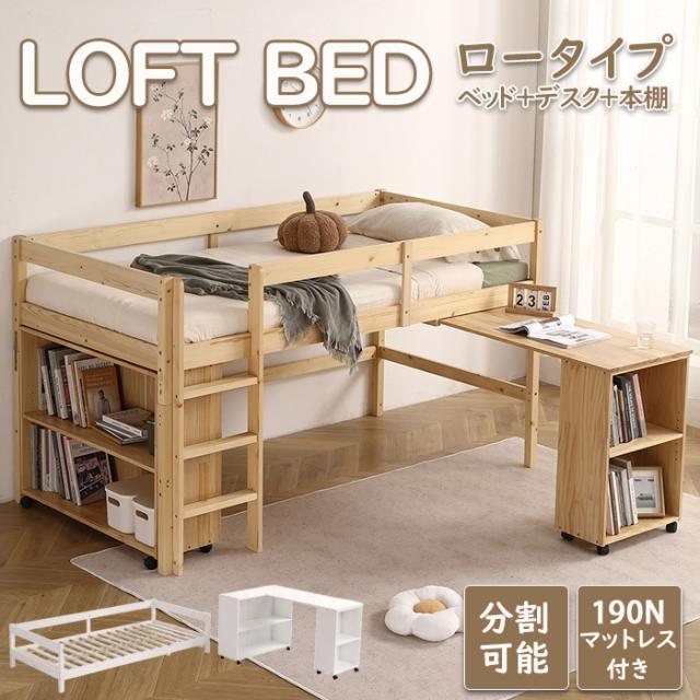 ■【10cm厚さマットレス付き】ロータイプ ロフトベッド 木製ベッド3点セット木製 シングルベッド デスク 学習机 本棚付き 天然木 収納棚付