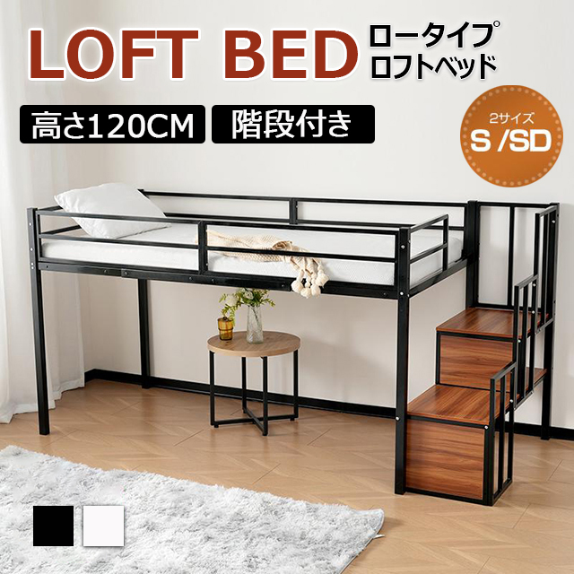 ■「2サイズ:Sシングル/SDセミダブル」ロータイプ ロフトベッド 高さ120cm 階段付き パイプベッド 耐震ベッド シングルベッド 子供ベッド
