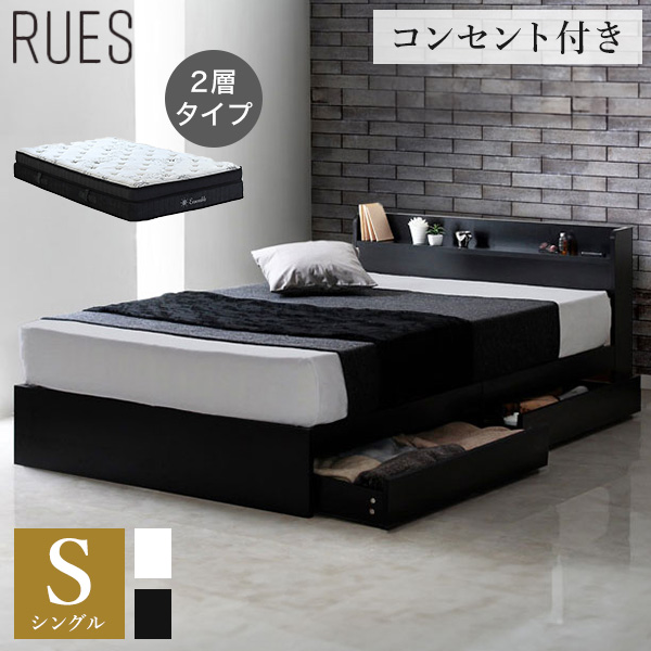 ■ルース ベッドフレーム シングルベッド 棚付き コンセント付き 収納付き フレーム ポケットコイル セット モノトーン 幅97cm(代引不可)【
