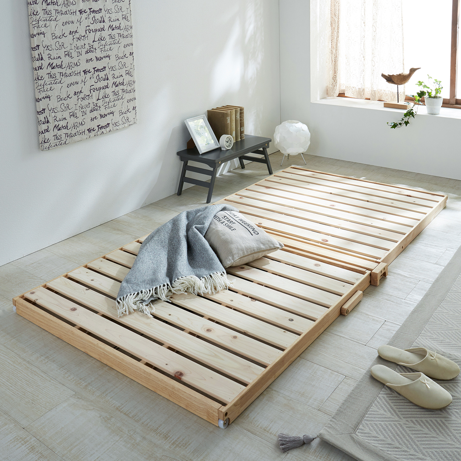 ーデザイン・スタイリングー天然木パイン材を使用したすのこベッド床板の静耐荷重量試験400kgに合格した頑丈なつくりで子どもがのっても安心です「子どもと安心して使うことができるすのこベッドが欲しい」というお客様の声に応えて開発使わない時は丸めてコンパクトに収納できて邪魔になりにくいセミシングルは他サイズと組み合わせて使うこともでき、シングルと組み合わせればクイーンに、セミダブルと組み合わせればキングサイズになりますー機能ー表面に溝切りをしてあるので、通気性がさらにアップ面取りした角当たりの優しい仕様と塗装仕上げで、布団もひっかかりにくいシングルとセミダブルは分割しているので持ち運びしやすく、押入れ収納もスムーズロール式すのこだから敷布団と一緒にたためます来客用に用意しておけて便利