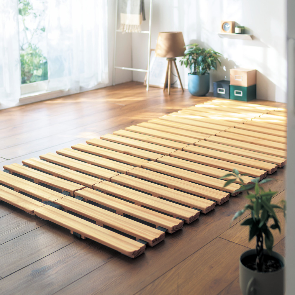 ーデザイン・スタイリングー・どんな空間でも使いやすいシンプルなデザイン・組み合わせればファミリーサイズにも対応ー素材ー・桐材で軽く、取り扱いやすいので収納もラクラク・表面のスリット加工で布団やマットレスが滑りにく、通気性も確保・底面と端に床を傷つけにくいクッション付き・脚が当たっても痛くない角丸仕様ー機能ー・すのこを敷くことで布団やマットレスの通気をよくしてくれる・しまう時は、端からクルクルと巻いて固定ベルトで固定・ロール状にして立てて収納できて便利