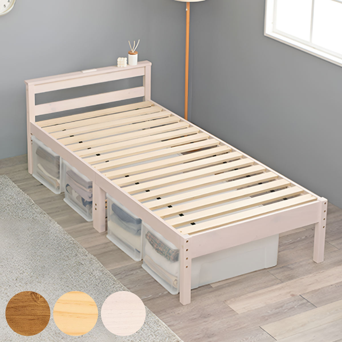 -商品名-シングルベッド 一人暮らし マットレス付き ローベッド ロータイプ フロア 低床 低い 連結可 つなげる 宮 ヘッドボード 枕元 棚 ラック 携帯 ティッシュ メガネ リモコン 頭上 収納 照明 読書灯 ライト 電気 コンセント ゲーム スマホ 充電 ヴィンテージ モダン レトロ