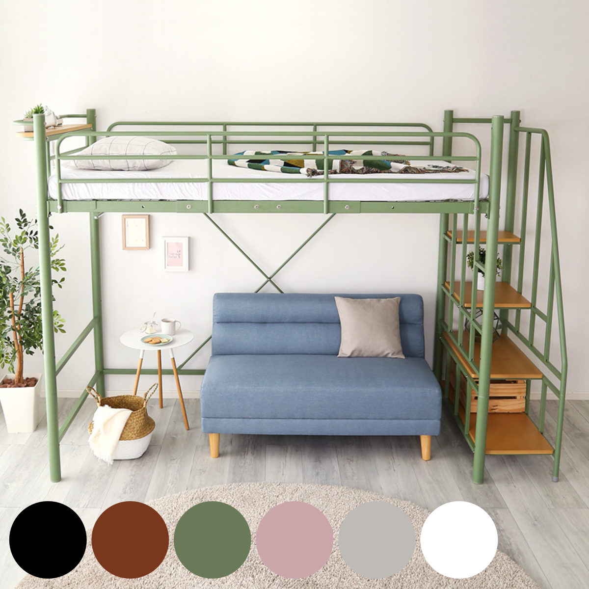 ■ロフトベッド シングル 階段付き 宮棚 2口コンセント付 ( ベッド 宮棚付き パイプハンガー コンセント付き 高さ調節 シングルベッド ロ