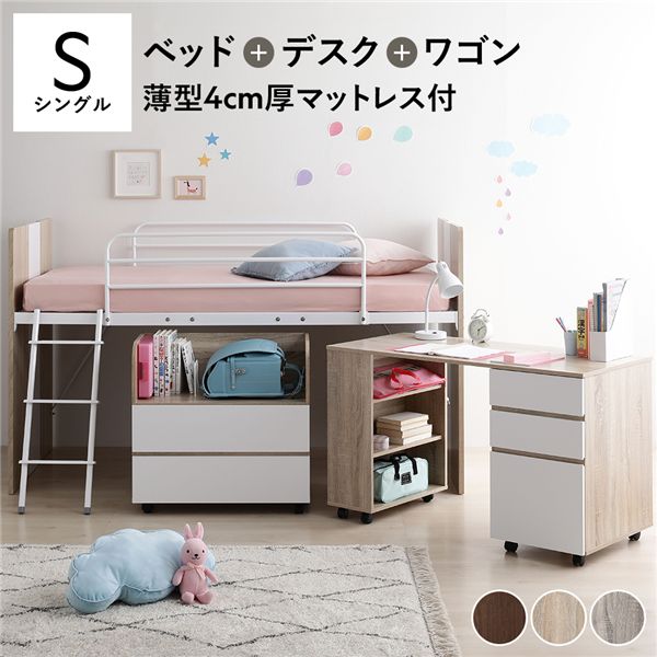 ■シングルベッド ナチュラル システムベッド 3点セット + マットレス付き ベッド幅102cm ナチュラル ロフトベッド 学習机 デスクワゴン