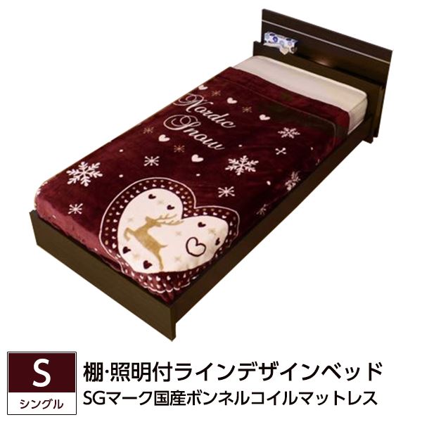 ■シングルベッド 茶色 ブラウン 茶 棚 照明付ラインデザインベッド SGマーク国産 日本製 国産ボンネルコイルマットレス付 茶 ダークブラ