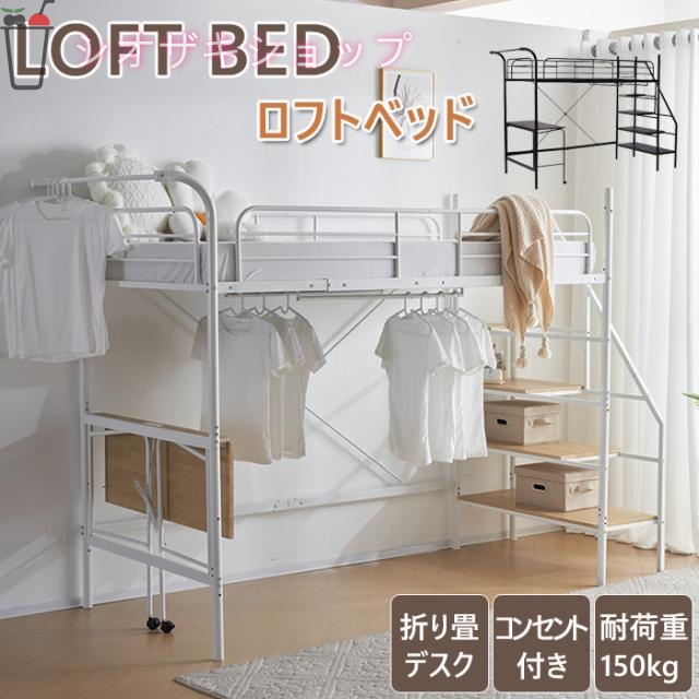 ■シングルベッド 白 ホワイト 単品 頑丈 ロフトベッド (フレームのみ) 白 ホワイト 2段階高さ調整可能 2口コンセント付き 梯子付き 通気