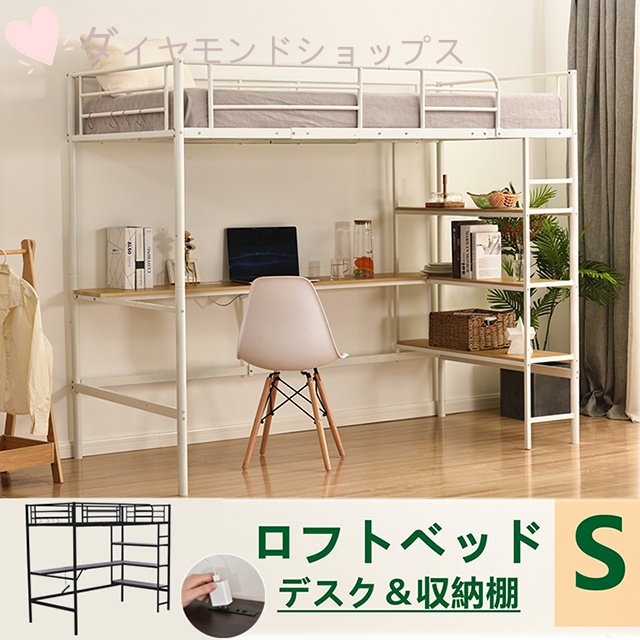 ■シングルベッド 白 ホワイト 単品 頑丈 ロフトベッド (フレームのみ) 白 ホワイト 2段階高さ調整可能 2口コンセント付き 梯子付き 通気