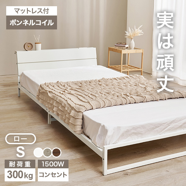 木目調のヘッドボード×スチールフレームの組み合わせがおしゃれなパイプベット。スッキリとしたデザインなので、お部屋に抜け感が生まれます。1人暮らしやワンルーム住まいにもおすすめ。耐荷重300kg相当の頑丈なつくりになっているので、子どもはもちろん大人まで安心してお使いいただけます。棚には2口コンセント(合計1500W)つきなので、スマートフォンの充電や間接照明を付けることも。カラーはホワイト/ダークブラウン/グレーからお選びいただけます。■ベッドフレーム【商品サイズ(約)】幅98×奥行212×高さ50.5cm【梱包サイズ(約)】106×38×13.5cm(17kg)【材質】棚板:合成樹脂化粧繊維板フレーム:スチール(粉体塗装)【生産国】中国【備考】組立品(プラスドライバー・ハンマーが必要)■マットレス【商品サイズ(約)】幅97×奥行195×高さ14.5cm【梱包サイズ(約)】100×28.5×28.5cm(14kg)【材質】中材:コイルスプリング(ボンネルコイル)詰物:ウレタンフォーム/フェルト生地(表/側面):ポリエステル100%生地(裏):ポリプロピレン100%【生産国】中国【備考】