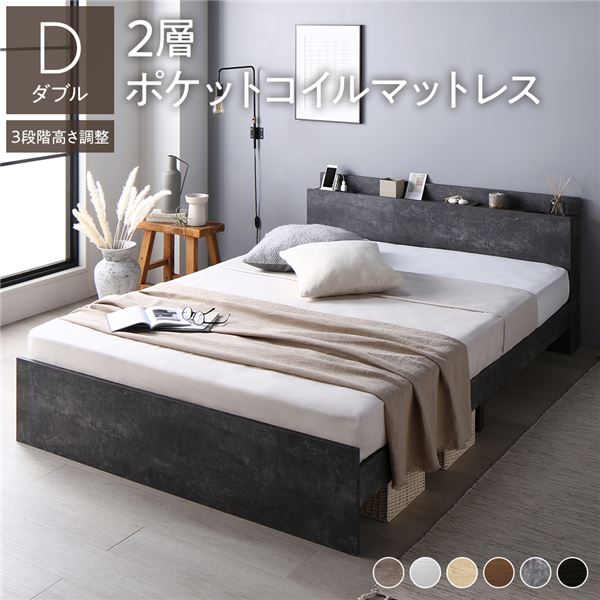 ■ダブルベッド グレー 灰色 ベッド 2層ポケットコイルマットレス付 ストーングレー 灰色 高さ調整可 宮付 すのこ ダブルベッド グレー 灰