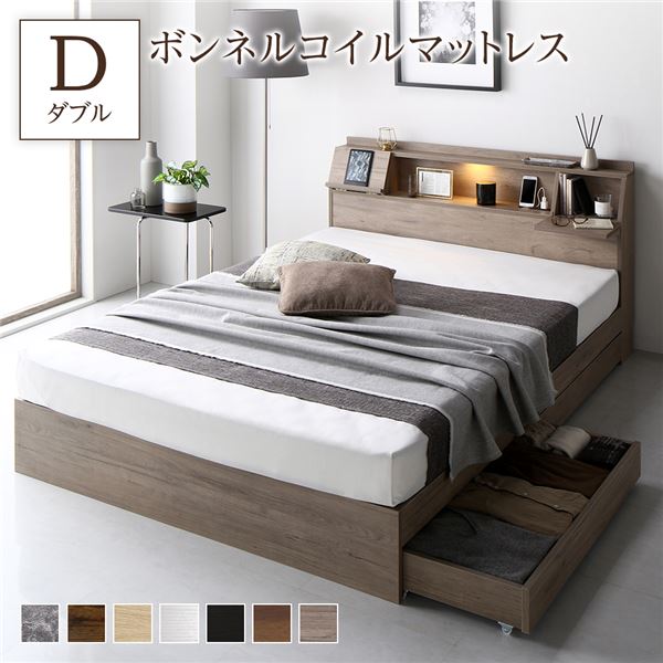 ■ダブルベッド 白 ホワイト、黒 ブラックから選べる 棚・コンセント付き収納ベッド スタンダードポケットコイルマットレス付き