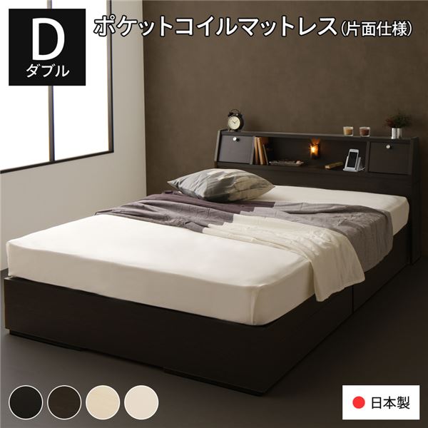 ■ダブルベッド 茶色 ブラウン 茶 ベッド 海外製ポケットコイルマットレス付き 片面仕様 茶 ダークブラウン こげ茶 収納付き 棚付き 日本