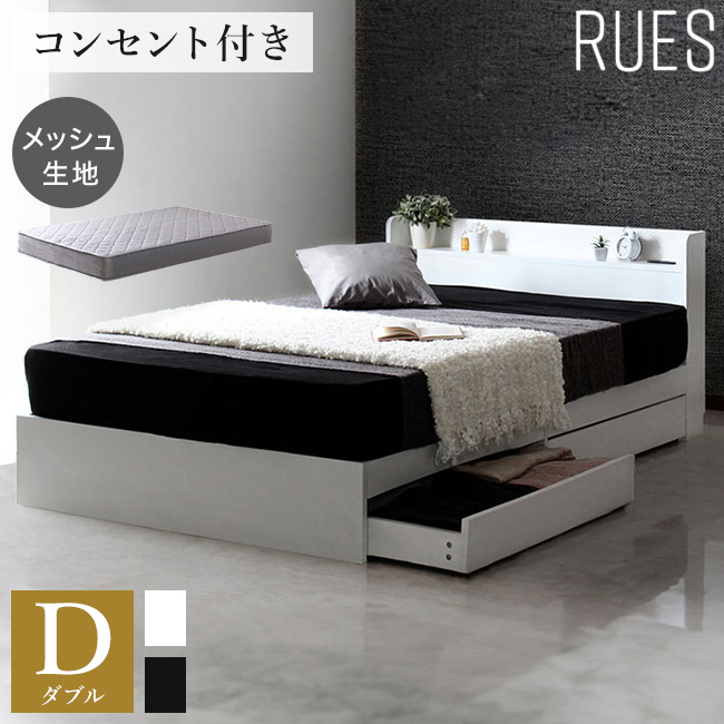■ルース ベッドフレーム ダブルベッド 棚付き コンセント付き 収納付き フレーム ポケットコイル セット モノトーン 幅140cm(代引不可)【