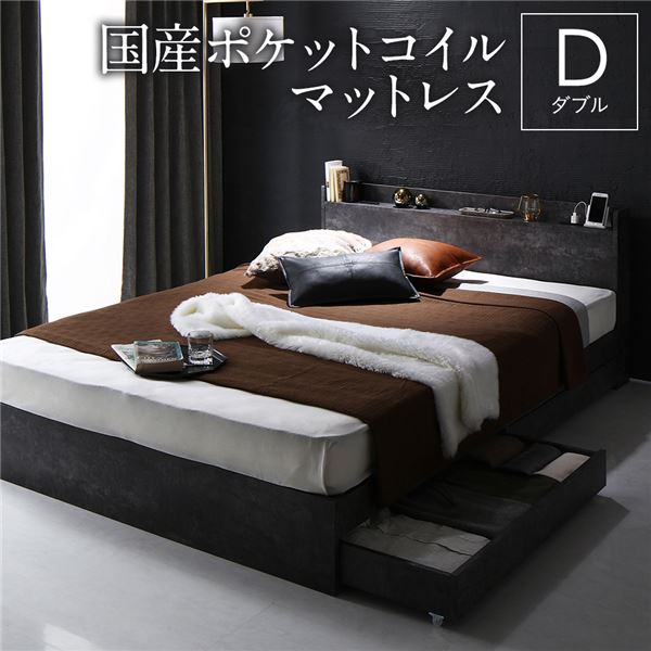 ■ダブルベッド グレー 灰色 ベッド 国産 日本製 国産ポケットコイルマットレス付 レギュラー ストーングレー 灰色 収納付き 宮付き