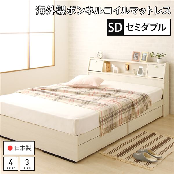■セミダブルベッド 白 ホワイト ベッド 日本製 国産 収納付き 引き出し付き 木製 照明付き 棚付き 宮付き コンセント付き 海外製ボンネル