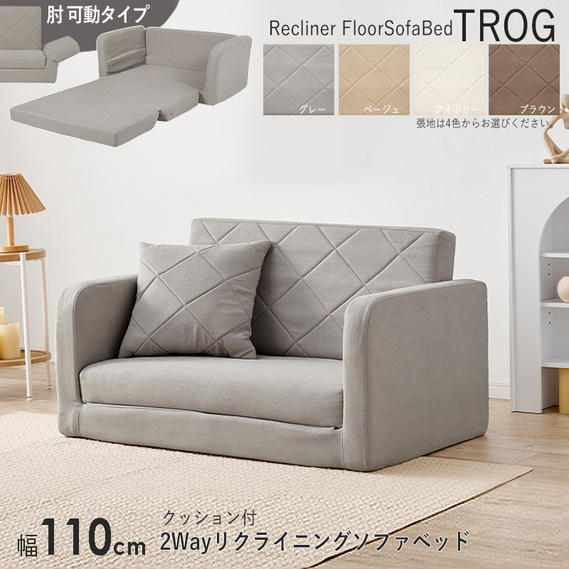 ■ソファベッド 2人掛け ひじ掛けリクライニング 1台単品 グレー色 くすみカラー全4色 幅110cm クッション付 2way 布張りコンパクト Trog