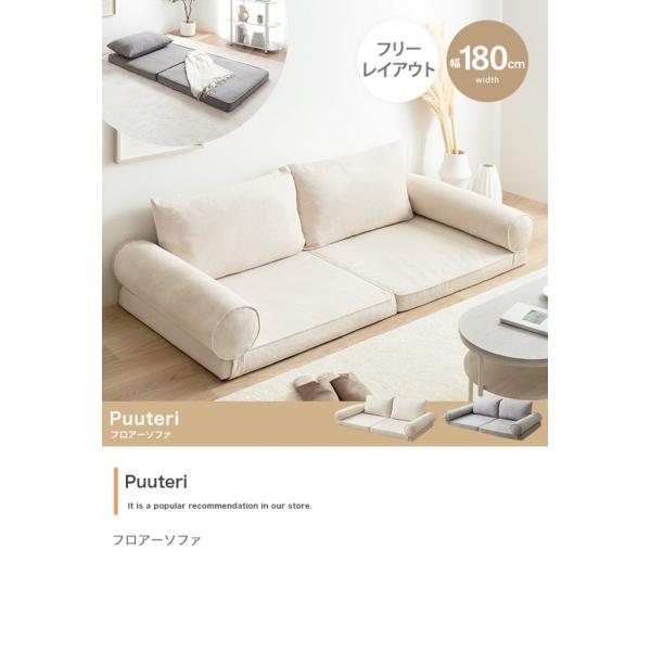 お部屋に圧迫感を与えないロー設計で、一人暮らしやワンルームにオススメの『Puuteri(プーテリ)』フロアーソファ。幅180cmと大人2人がゆとりをもって座れるほどの大きさ。座面の厚みは約10cmあり程よい硬さのため底付き感を感じさせません。サイドクッションと背もたれクッションは取り外しが可能で、用途に合わせて組み換えてベッドにしたり1人掛け用ソファとしてもお使いいただけます。配達業者を指定いただくことはできません。沖縄・離島に関しましては、別途配送料が必要となります。北海道への配送も別途配送料が必要になる場合がございます。※別途送料が発生する場合は後ほどご連絡させていただきます。タイミングによっては在庫切れの場合があります。
