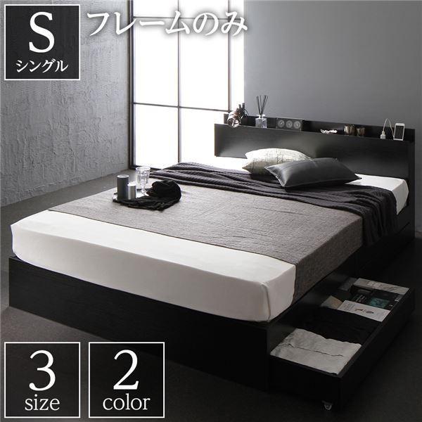■ベッド 収納付き 引き出し付き 木製 棚付き 宮付き コンセント付き シンプル モダン ブラック シングル ベッドフレームのみ 【北海道・沖