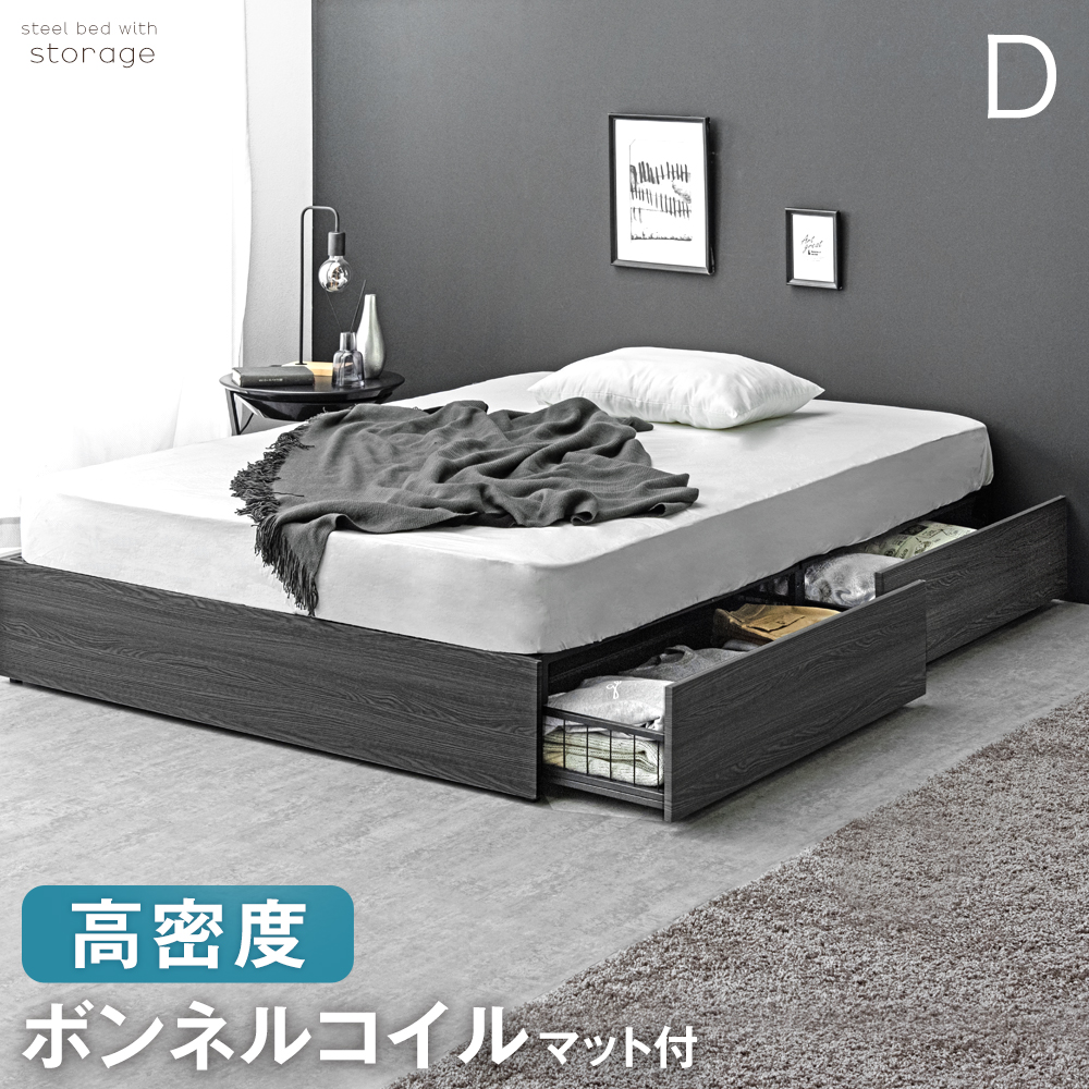 ■【正午〜P5%還元】 ベッド マットレス付き ダブル 収納付き 頑丈 スチール ヘッドボードなし 収納ベッド 収納付きベッド ヘッドレス スチ