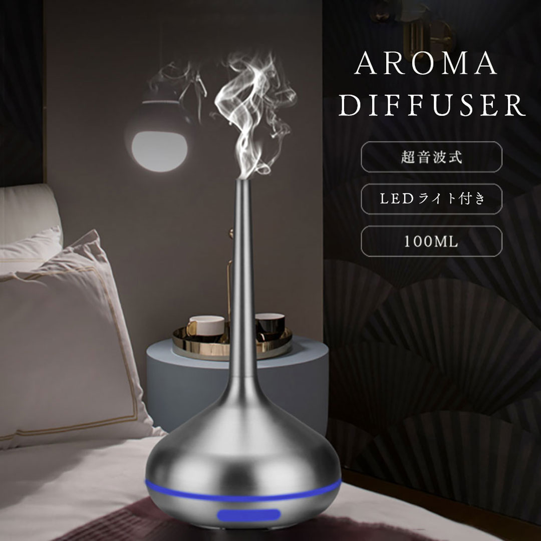 ■【在庫限り】アロマディフューザー 細長 シルバー メタリック LED 照明 ミスト アロマ ランプ ナイト ライト 超音波 卓上 リビング 部屋