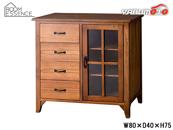 ■東谷 ティンバー キャビネット ブラウン W80×D40×H75 PM-320 完成品 引き出し付 ガラス扉 棚 サイドボード メーカー直送 送料無料